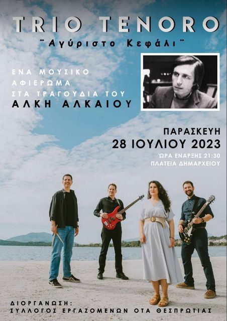 ·        Συναυλία προς τιμήν του θεσπρωτού  Άλκη Αλκαίου ποιητή και στιχουργού, παρασκευή  28/7/2023 στις 22.00 στη πλατεία δημαρχείου Ηγουμενίτσας με τη συμμετοχή των Trio Tenoro.