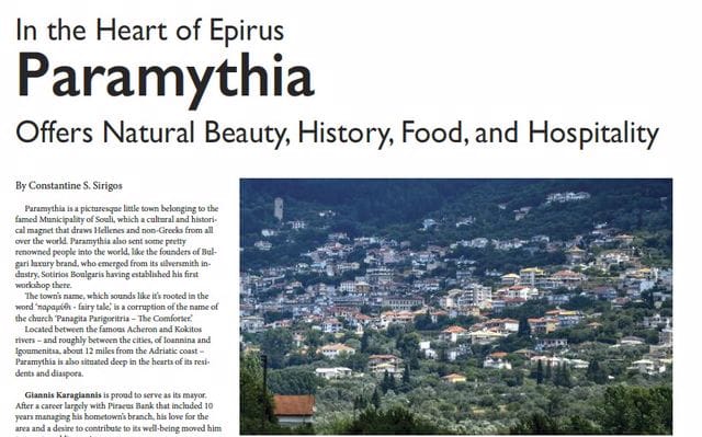 Αφιέρωμα στην Ήπειρο έκανε ο Εθνικός Κήρυκας με συνέντευξη του Περιφερειάρχη κ.Αλέξανδρου Καχριμάνη, που εξυμνεί τις ομορφιές της Ηπείρου, του Δημάρχου Σουλίου, κ.Ιωάννη Καραγιάννη, της κας.Αθηνάς Καλύβα, Γενικής Γραμματέας Φορολογικής Πολιτικής και Δημοσίων Εσόδων, της ζωγράφου κας.Φρειδερίκης Παππά και του επιχειρηματία, ιδρυτή και ηγέτη της πολιτιστικής οργάνωσης της «ΑΧΕΠΑ» στην Αμερική, κ.Λου Κάτσος, που περιγράφουν την Παραμυθιά ως τόπο προσέλκυσης των τουριστών.