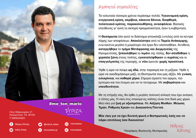 Μήνυμα Μ. Κάτση για τις επικείμενες εκλογές – Νίκη για να έχει δυνατή φωνή ο θεσπρωτικός λαός και να πάρει επιτέλους όσα δικαιούται