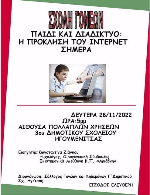 Τό 3ο Δημοτικο Σχολείο Ηγουμενίτσας υποδέχεται τη Δευτέρα 28-11- 2022 την ψυχολόγο και επιστημονικά υπεύθυνη του Κ.Π. “Αριάδνη” κα Κωνσταντίνα Ζιαγκου. Με ένα θέμα επικαιρο , την εξάρτηση των παιδιών από το διαδίκτυο….