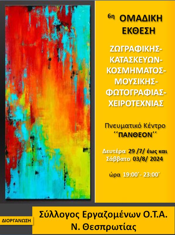 6η Εικαστική έκθεση από 29/7/2024 ως 3/8/2024 στην αίθουσα του πνευματικού κέντρο ΠΑΝΘΕΟΝ (ζωγραφική-κατασκευές-χειροτεχνία-κέντημα- κόσμημα- φωτογραφία)