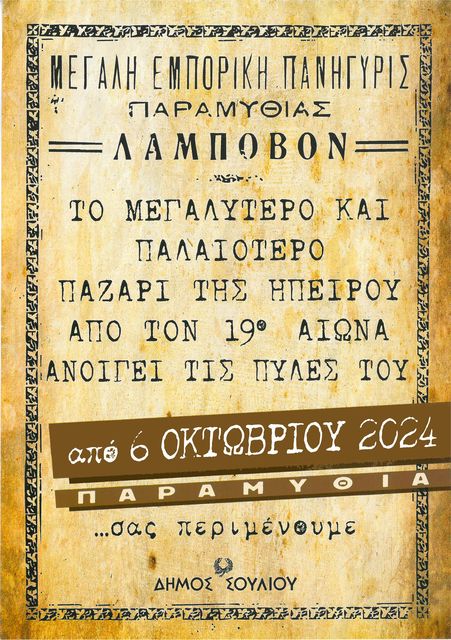 Ο δήμος Σουλίου σας προσκαλεί στο Λάμποβο, στην παλαιότερη και μεγαλύτερη ετήσια εμποροπανήγυρη της Ηπείρου, που θα διεξαχθεί στην Παραμυθιά από 6 -13 Οκτωβρίου 2024. Ο Λάμποβος αποτελεί θεσμό για την περιοχή μας, διατηρώντας μια παράδοση αιώνων και προσελκύει το ενδιαφέρον εκατοντάδων επισκεπτών και εμπόρων από όλη την Ελλάδα, με την πληρότητα να αγγίζει το 100%.