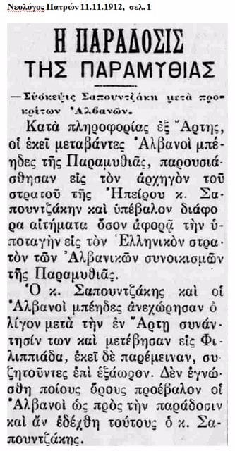 Λαμβάνω την τιμήν αναγγείλω ότι αντισυνταγματάρχης Ηπίτης εισήλθεν 23ην τρέχοντος 1 μ.μ. ώραν εις Παραμυθίαν μετά ταγμάτων Φιλιακού, Πλατή, λόχου Παπαδάκη, δύο ουλαμών πυροβολικού και ουλαμού ιππικού. Αναμένονται εκεί δια Σκάλας Παραμυθιάς υπόλοιποι δυνάμεις. Ετελέσθη αμέσως δοξολογία χοροστατούντος Μητροπολίτου Νεοφύτου. Συγκίνησις πλήθους κλαίοντος εν εκκλησία κατόπιν ωραίας προσλαλιάς Μητροπολίτου περί Ελλάδος. Περισυλλογή όπλων ήρχισεν. Αναμένεται κατάληψις Μαργαριτίου »