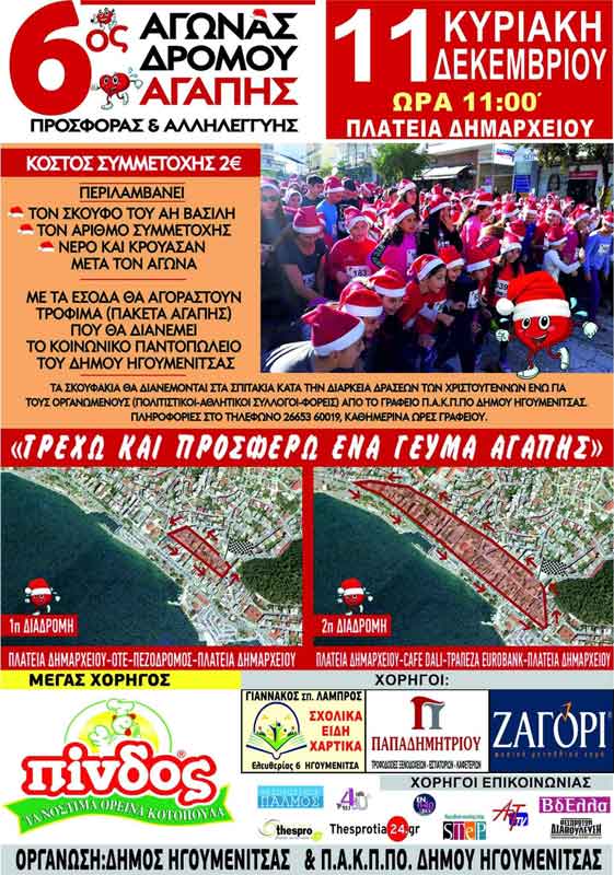 Ο Δήμος Ηγουμενίτσας, τo Τμήμα Αθλητισμού-Πολιτισμού του Π.Α.Κ.Π.ΠΟ Δήμου Ηγουμενίτσας και η Δημοτική Κοινότητα Ηγουμενίτσας, σε συνδιοργάνωση αθλητικών, πολιτιστικών συλλόγων και άλλων φορέων του Δήμου Ηγουμενίτσας, προσκαλούν μικρούς και μεγάλους να συμμετάσχουν στον «6ο Αγώνα Δρόμου Αγάπης, Προσφοράς και Αλληλεγγύης» που θα γίνει την Κυριακή 11 Δεκεμβρίου 2022 και ώρα 11:00, στο πλαίσιο των εορταστικών εκδηλώσεων Χριστουγέννων και Πρωτοχρονιάς, με συμβολική συμμετοχή 2€, που θα περιλαμβάνει 1 σκουφάκι του Αϊ Βασίλη, τον αριθμό συμμετοχής και ένα κρουασάν με 1 νεράκι μετά τον αγώνα.