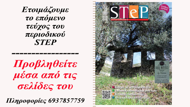 Πριν το Πάσχα θα κυκλοφορήσει το επόμενο τεύχος του κορυφαίου περιοδικού της Hπείρου, το Step με θεματολογία, όπως πάντα, από όλη την Ήπειρο. Αφιερώματα από Θεσπρωτία, Άρτα, Πρέβεζα, Ιωάννινα, αφιέρωμα στο νέο θέατρο της Ηγουμενίτσας ΦΑΟΣ και με ύλη γενικού ενδιαφέροντος όπως συνταγές, ομορφιά και υγεία, σταυρόλεξο, soduko, ανέκδοτα…..