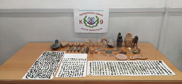 Συγκεκριμένα, σε έλεγχο που διενεργήθηκε από τα εν λόγω στελέχη στην πύλη εισόδου του λιμένα εξωτερικού Ηγουμενίτσας σε Ι.Χ.Ε. όχημα, με οδηγό τον 52χρονο και συνοδηγό τον 49χρονο, εντοπίστηκαν, επιμελώς κρυμμένα, εντός του χώρου αποσκευών του ως άνω οχήματος, είκοσι οκτώ (28) αντικείμενα (αγαλματίδια, κολιέ, μενταγιόν, λυχνάρια, βάζο κ.τ.λ.) πιθανόν αρχαία καθώς και επτακόσια εβδομήντα εννέα (779) αρχαία νομίσματα, με σκοπό οι ανωτέρω να τα μεταφέρουν από κοινού παράνομα στο εξωτερικό.