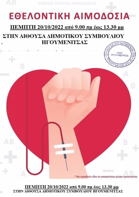Ο Σύλλογος Εργαζομένων ΟΤΑ Ν Θεσπρωτίας καλεί όλους τους συναδέλφους (Ηγουμενίτσα ,Φιλιάτες και Σούλι )που είναι αιμοδότες, όλους όσους χρειάστηκαν το προηγούμενο διάστημα αίμα για κάποιον δικό τους άνθρωπο, αλλά και όλους όσους έχουν συνειδητοποιήσει την ανάγκη ενίσχυσης αυτής της εθελοντικής πράξης, να βοηθήσουν και να συμμετέχουν στην οργάνωση της ΕΘΕΛΟΝΤΙΚΗΣ ΑΙΜΟΔΟΣΙΑΣ που θα γίνει την