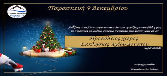 Ο Δήμος Σουλίου,ο Φιλοπρόοδος Όμιλος Παραμυθιάς (Φ.Ο.Π), τα ΚΔΑΠ “Αρωγή” καθώς και ο Σύλλογος γονέων και κηδεμόνων του Δημοτικού Σχολείου Παραμυθιάς, σας προσκαλούν την Παρασκευή 09 Δεκεμβρίου 2022 και ώρα 20:00, στον αύλειο χώρο της εκκλησίας του Αγίου Δονάτου στην Παραμυθιά, όπου θα πραγματοποιηθεί το άναμμα των φώτων του Χριστουγεννιάτικου Δέντρου.