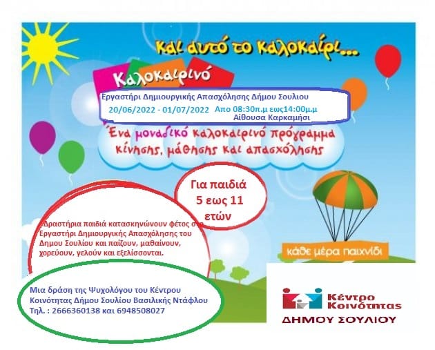 Το Κέντρο Κοινότητας του Δήμου Σουλίου διοργανώνει από Δευτέρα 20/06/2022 έως Παρασκευή 01/07/2022 και ώρες 8:30πμ έως 14:00μμ Εργαστήρι Δημιουργικής Απασχόλησης για παιδιά ηλικίας 5 έως 11 ετών, , στην αίθουσα Καρκαμισι. Η δράση αυτή αφορά εργαζόμενες μητέρες με σκοπό τη παροχή βοήθειας, απασχολώντας δημιουργικά τα παιδιά σχολικής ηλικίας (5-11 ετών).