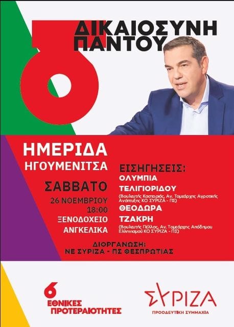 Πολιτική εκδήλωση οργανώνει ο Συριζα το Σάββατο 26-11-2022 στις 6 η ωρα στο ξενοδοχείο Αγγέλικα, με παρουσίαση των 6 βασικών εθνικών προτεραιοτήτων απο τις προγραμματικές θέσεις του Συριζα. Εισηγήτριες θα είναι η Θεοδώρα Τζάκρη βουλευτής Πέλλας, και η Τελιγιορίδου Ολυμπια βουλευτής Καστοριας, τομεάρχης αγροτικών θεμάτων.