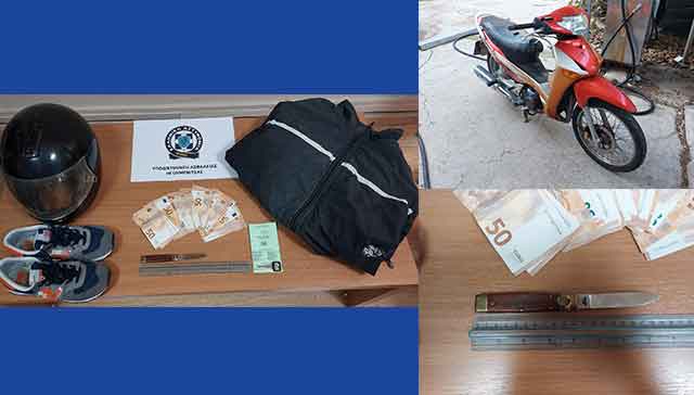 Βρέθηκαν και κατασχέθηκαν το χρηματικό ποσό των 1.100 ευρώ από τα αφαιρεθέντα χρήματα, ο σουγιάς, το κράνος, ρουχισμός και η μοτοσικλέτα που χρησιμοποίησε o κατηγορούμενος κατά την τέλεση της ληστείας.