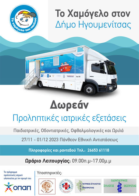 Δωρεάν προληπτικές ιατρικές και οδοντιατρικές εξετάσεις σε παιδιά/μαθητές του Δήμου Ηγουμενίτσας θα πραγματοποιηθούν από τη Δευτέρα 27 Νοεμβρίου 2023 έως και την Παρασκευή 1 Δεκεμβρίου 2023, στο πλαίσιο της Δράσης Προληπτικής Ιατρικής / Οδοντιατρικής «ΙΠΠΟΚΡΑΤΗΣ», που υλοποιεί ο Οργανισμός «Το Χαμόγελο του Παιδιού» από το 2002.