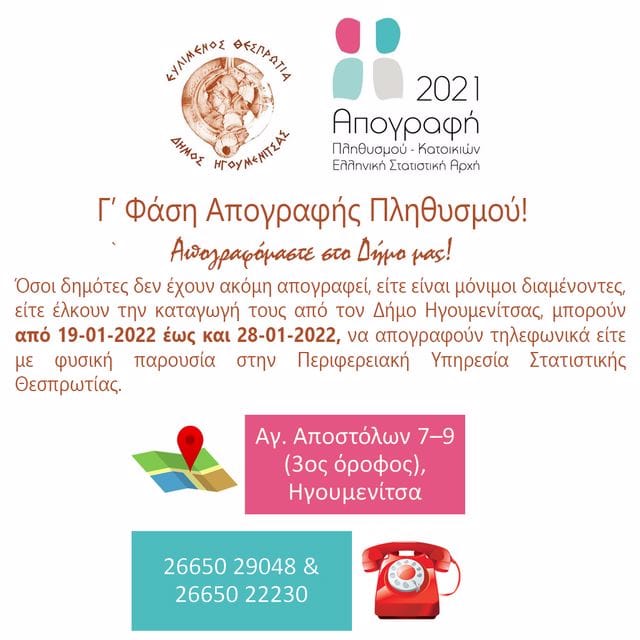 Με αφορμή την Απογραφή Πληθυσμού 2021, η οποία συνεχίζεται στην τρίτη φάση της πλέον, καλούμε να συμμετάσχουν στη διαδικασία, από 19/01/2022 έως 28/01/2022, όσους δημότες δεν έχουν ακόμη απογραφεί και είτε διαμένουν μόνιμα στο Δήμο μας, είτε έλκουν την καταγωγή τους από τον Δήμο Ηγουμενίτσας.