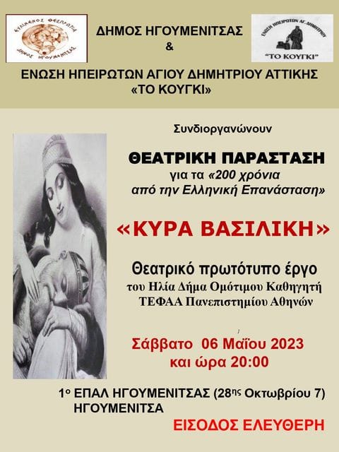 Σας προσκαλούμε στη θεατρική παράσταση «ΚΥΡΑ ΒΑΣΙΛΙΚΗ» που συνδιοργανώνουν ο Δήμος Ηγουμενίτσας με την Ένωση Ηπειρωτών Αγίου Δημητρίου Αττικής «ΤΟ ΚΟΥΓΚΙ» το Σάββατο 06 Μαΐου 2023 και ώρα 20:00, στο 1ο ΕΠΑΛ Ηγουμενίτσας (28ης Οκτωβρίου 7) με ΕΙΣΟΔΟ ΕΛΕΥΘΕΡΗ.