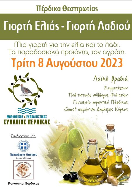 • Τρίτη 08/08/2023 και ώρα 21:00 «16η Γιορτή Λαδιού» που διοργανώνουν η ΤΚ Πέρδικας και ο Πολιτιστικός και Επιμορφωτικός Σύλλογος Πέρδικας στο θέατρο Πέρδικας στις 21:00 με ελεύθερη είσοδο,