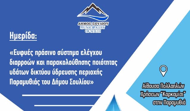 Στο πλαίσιο υλοποίησης του έργου με τίτλο: «Ευφυές Πράσινο Σύστημα Ελέγχου Διαρροών και Παρακολούθησης Ποιότητας Υδάτων Δικτύου Ύδρευσης Περιοχής Παραμυθιάς του Δήμου Σουλίου» ο Δήμος Σουλίου διοργανώνει ενημερωτική ημερίδα ανοιχτή στο κοινό την Δευτέρα 12 Δεκεμβρίου 2022 τις 09:00-11:00 στην Αίθουσα Πολλαπλών Χρήσεων “Καρκαμίσι”, στην Παραμυθιά.