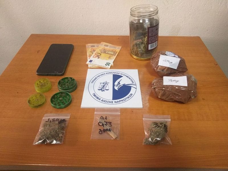 Ακολούθησε έρευνα στο σπίτι του με τη συνδρομή και του αστυνομικού σκύλου «Lussy», όπου βρέθηκαν και κατασχέθηκαν συνολική ποσότητα ακατέργαστης κάνναβης βάρους -114,19- γραμμαρίων, δύο θρυμματιστές κάνναβης και χρηματικό ποσό -100- ευρώ.