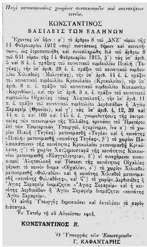 «  Απαγορεύεται απολύτως η χρήσις των παλαιών ονομάτων υπό των δημοσίων αρχών ή οργάνων εν τη επισήμω αλληλογραφία αυτών, των συλλόγων, σωματείων, συνεταιρισμών κλπ. νομικών προσώπων εν τη αλληλογραφία αυτών. Η παράβασις της απαγορεύσεως ταύτης αποτελεί πταισματικήν παράβασιν τιμωρουμένην με πρόστιμον μέχρι 100 δραχμών ή με κράτησιν μέχρι 10 ημερών » ( Πηγή : ΦΕΚ Α΄. 281/1927)