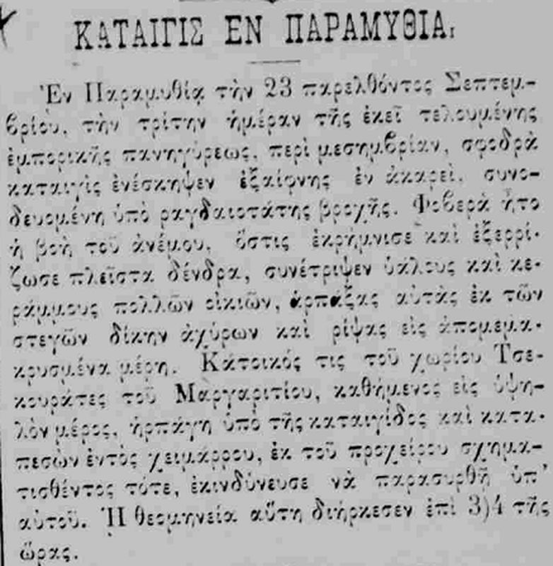 « Φέτος δε ένεκα της μεγάλης ανεχείας και της ανησύχου (πολιτικής) καταστάσεως σχεδόν ουδέν εγένετο, και ολίγιστοι συνέρρευσαν, μη έχοντες προσωπικήν ασφάλειαν ένεκα των αρπακτικών και κακοβούλων τάσεων βέηδων τινων, καταπιέσωσι τους δυστυχείς χριστιανούς της επαρχίας ταύτης και καταστήσωσι τη χώραν λείαν αυτών. Καθ’ εκάστην και νέον είδος μηχανορραφίας και συκοφαντίας εξυφαίνουσι προς ενελεή εξολόθρευσιν του χριστιανικού στοιχείου του αείποτε και υπό τας μάλλον δυσμενείς περιστάσεις οργώντος προς πρόοδον και σχετικήν ευημερίαν του. Προς δε έστρεψαν τα βλέμματα των και κατά του αγίου Παραμυθίας Κωνσταντίνου Μικρούλη, ούτινος ο ανδρικός, χριστιανικός και εθνικός χαρακτήρ εσκανδάλισε τους προύχοντας της επαρχίας και εζήτησαν και επέτυχον, όπως ευρίσκονται εις διένεξιν, μη επιδεχομένην θεραπεία αι δύο αρχαί του τόπου, η εκκλησιαστική και διοικητική, αίτινες και μόναι δύνανται να επουλώσωσι τας πληγάς του πάσχοντος λαού υπό θεομηνιών, ως των πέρισυ σεισμών, περί ων επο-μένως θα γράψομεν, και των άλλων εν γένει καταστρεπτικών στοιχεί-ων. Τα πάνδεινα πάσχουσιν οι δυστυχείς χωρικοί και αστοί της επαρ-χίας ταύτης από πολλών ετών υπό ισχυρού τινος και αιμοβόρου βέη, όστις ουδέν άλλο έχει να πράττει, ειμή του μεν να τρώγει τα χρήματα, άπερ λόγω δανείου έλαβε, του δε να εξαφανίζει και λαμβάνει ως λίαν τα κτήνη και παν το υπό τα όμματα αυτού προσπίπτον, άλλους δε δια διαφόρων εξυφαινομένων κατηγοριών και συκοφαντιών να πειράται και εξορίζει εις μέρη ένθα κακόν κακώς οι ατυχείς ευρίσκουσι το τέλος των απορφανουμένων ούτω και των οικογενειών από των μόνων προστατών αυτών, και άλλα τοιαύτα και παρόμοια διαπράττοντος ανενοχλήτως και τα πάντα μηχανώντος προς τελείαν καταστροφήν του τόπου. – Πάντες εύχονται όπως ο ύψιστος απαλλάξει αυτούς χριστιανούς και μωαμεθανούς από του αιμοβόρου και απανθρώπου τούτου και ο τόπος ίδει ημέραν τινά ευημερίας και ησυχίας. Εις αυτόν δε οφείλεται και αισχρά συκοφαντία ήτις ανεκαλύφθη εσχάτως κατά αθώων πολιτών ».