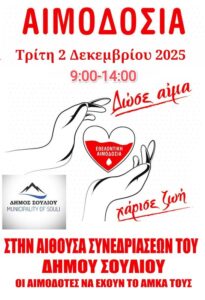 ΤΕΤΑΡΤΗ 3 ΔΕΚΕΜΒΡΙΟΥ στον δήμο Σουλίου στην αίθουσα δημοτικού συμβουλίου και ώρα 9.00πμ ως 14.00 μ.μ