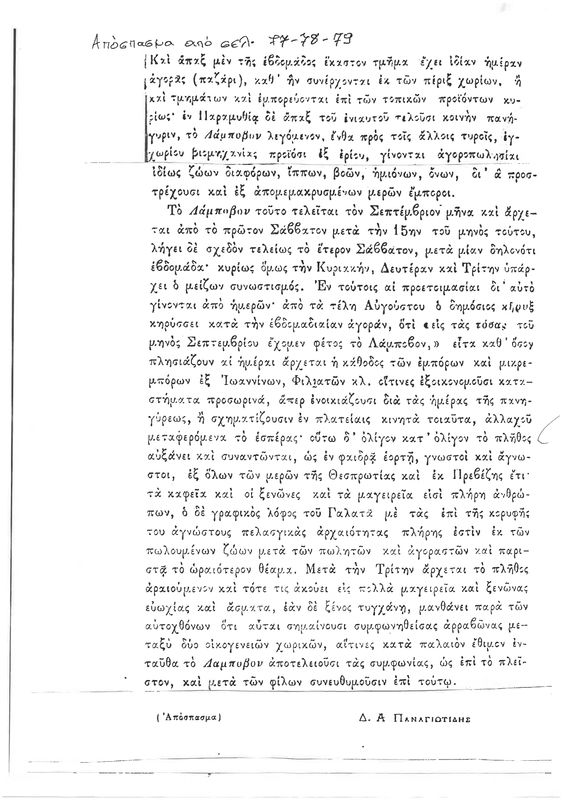 Επ’ ευκαιρία του πέρατος της ομολογουμένως επιτυχημένης ετήσιας εθιμικής φετινής εμποροπανήγυρης Παραμυθιάς με την παγκοινώς γνωστή διατηρητέα ονομασία «ΛΑΜΠΟΒΟΝ» θεωρώ χρήσιμο να φέρω στο φως της δημοσιότητας κείμενο που αφορά την γλαφυρή περιγραφή των ηθών, εθίμων, συνηθειών, των συνθηκών εμπορικών συναλλαγών και τρόπου συναθροίσεων του κοινού και των επισκεπτών της του έτους 1896 που περιλαμβάνεται στο βιβλίο «Εικονογραφημένουν Ηπειρωτικόν Ημερολόγιο» του Ηπειρώτη συγγραφέα Γεωργίου – ΓΑΛΑΡΗ εκδοθέν από το τυπογραφείο ΔΩΔΩΝΗ.