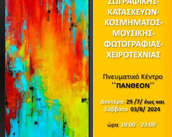 6η Εικαστική έκθεση από 29/7/2024 ως 3/8/2024 στην αίθουσα του πνευματικού κέντρο ΠΑΝΘΕΟΝ (ζωγραφική-κατασκευές-χειροτεχνία-κέντημα- κόσμημα- φωτογραφία)