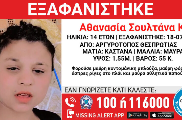 ΒΡΕΘΗΚΕ ΕΞΑΦΑΝΙΣΗ ΤΗΣ ΑΘΑΝΑΣΙΑΣ ΣΟΥΛΤΑΝΑΣ Κ., 14 ΕΤΩΝ Στις 18/07/2024, πρωινές ώρες, εξαφανίστηκε από...