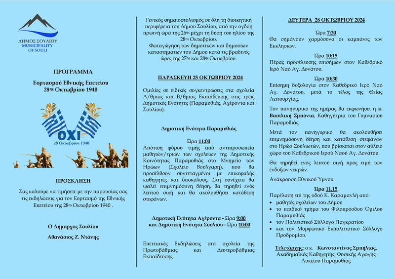 Αρχική » Δήμος Σουλίου: Πρόγραμμα εορτασμού 28ης Οκτωβρίου