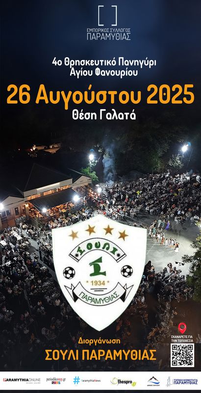 Θα θέλαμε να ενημερώσουμε ότι το ΔΣ του Εμπορικού Συλλόγου Παραμυθιάς πήρε την απόφαση να παραχωρήσει την διοργάνωση και την οικονομική διαχείριση του πανηγυριού του Αγίου Φανουρίου που θα πραγματοποιηθεί στις 26/08 στη θέση ΓΑΛΑΤΑ ,στο ΔΣ της ομάδας ΑΠΣ Σούλι Παραμυθιάς