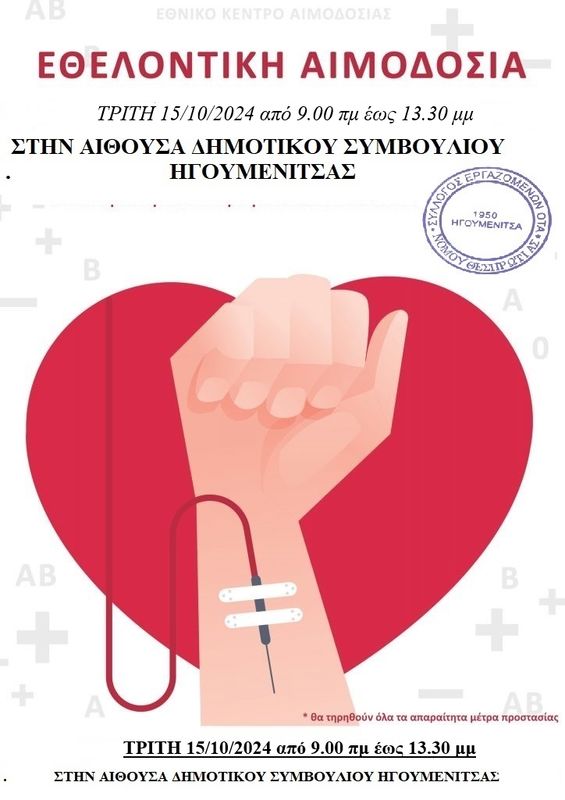 Ο Σύλλογος Εργαζομένων ΟΤΑ Ν Θεσπρωτίας καλεί όλους τους συναδέλφους (Ηγουμενίτσα ,Φιλιάτες και Σούλι )που είναι αιμοδότες, όλους όσους χρειάστηκαν το προηγούμενο διάστημα αίμα για κάποιον δικό τους άνθρωπο, αλλά και όλους όσους έχουν συνειδητοποιήσει την ανάγκη ενίσχυσης αυτής της εθελοντικής πράξης, να βοηθήσουν και να συμμετέχουν στην οργάνωση της ΕΘΕΛΟΝΤΙΚΗΣ ΑΙΜΟΔΟΣΙΑΣ που θα γίνει την