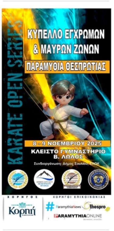 Η Παραμυθιά φιλοξενεί το Open Series Καράτε Δυτικής Ελλάδας 2025, μια σπουδαία διοργάνωση Καράτε που συγκεντρώνει αθλητές και προπονητές από όλη την Ελλάδα. Οι αγώνες θα διεξαχθούν στις 8 & 9 Νοεμβρίου 2025 στο Κλειστό Γυμναστήριο Παραμυθιάς “ΒΑΣ. ΛΩΛΟΣ”, σε ένα κλίμα ευγενούς άμιλλας, πειθαρχίας και σεβασμού — αξίες που εκφράζουν το αληθινό πνεύμα του Καράτε.
