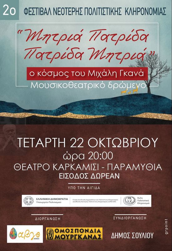 Ποιήματα και άλλα έργα του Μιχάλη Γκανά από τη «Μητριά Πατρίδα» ζωντανεύουν επί σκηνής μέσα από τη δραματοποιημένη ποίηση — μια λιτή, συγκινητική θεατρική αφήγηση, αφιερωμένη στις μικρές πατρίδες που δεν ξεχνιούνται.