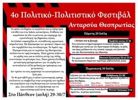 4ο Πολιτικό-Πολιτιστικό Φεστιβάλ Ανταρσύα Θεσπρωτίας 29-30/7 στην Ηγουμενίτσα στο¨πάνθεον” (αυλή). Εν μέσω πανδημίας το...